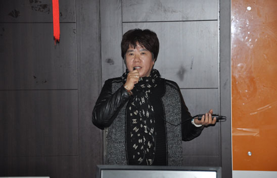 设计部顾大师"君通互联商机与品牌无线延伸"最终夺得2014君通科技“对外宣传广告语”最佳作品奖,图为顾大师做寓意解说