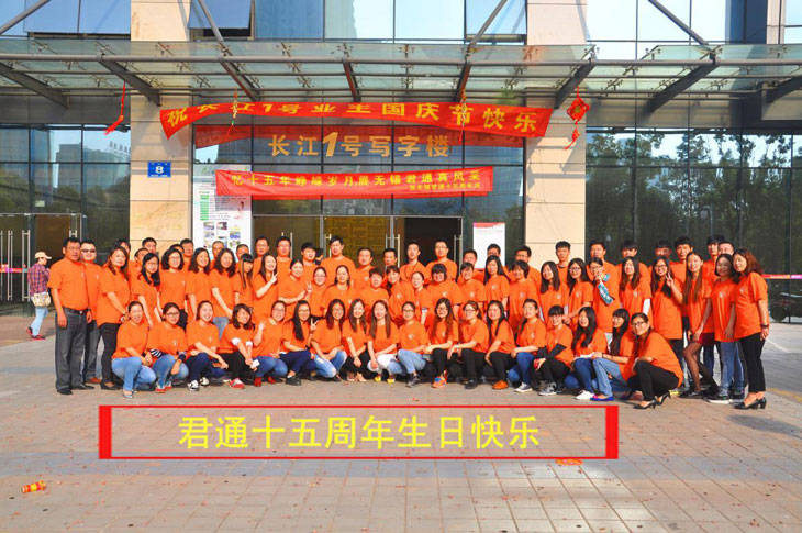 2015年 10月21号早上八点,君通全体员工穿着印着君通logo的村衫在我们公司楼下放烟花鞭炮,撒糖果,并全体员工一起合影。