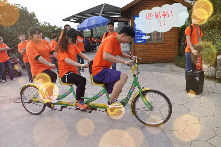 临近中午,大家歇息片刻就开始吃午餐,午餐结束后,休息片刻便进行了下午的自行车比赛,有三人自行车和两人自行车,大家都踊跃参加!