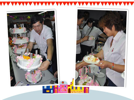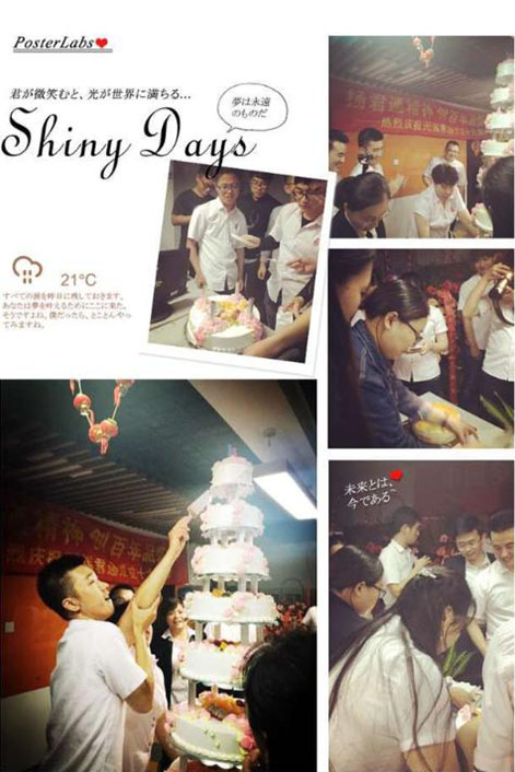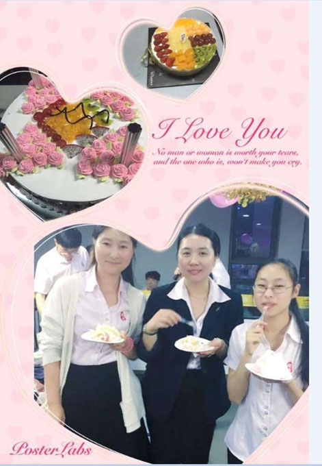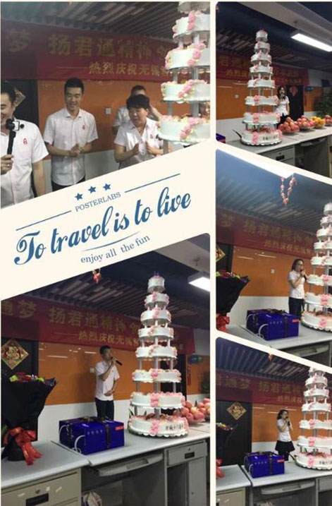 说出对尹总、对公司的各种感激的情愫和送出对公司的祝福后,伙伴们最最期待的大蛋糕的心都快融化了,不过别急,在品尝我们17岁的大蛋糕前,尹总突然邀请软件部的茹宁上台,原来今天也是软件部茹宁的生日,贴心的尹总特意为她献上了鲜花和蛋糕: