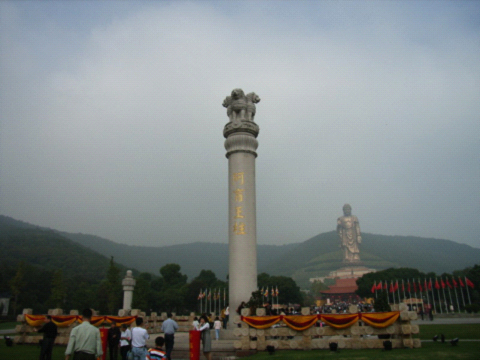 似近又远的望去,蓝天碧水间,高大的灵山大佛双目垂视,眼神睿智慈祥,在一片浓郁的青山环绕之中,好像一幅淡然的水墨画,渲染着宁静的意境,又仿佛浓墨的重彩画,渗透着高贵的气息。刚一下车,顿觉阵阵寒意袭来,车内的温暖跟外面阴沉沉的天气形成了强烈的对比,每个人都裹紧了衣服。进园前集合时尹总的一番话又调动了大家的热情,看着旁边还有一波又一波远道而来的旅游团,甚至还有手抱婴儿或者推着婴儿手推车的旅客们,似乎感觉又没那么冷了。进园之后大家就自由活动了,呵呵,下面就跟随我们的脚步来简单领略一下不一样的灵山胜景吧。