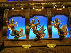灵山梵宫坐落于烟波浩淼的太湖之滨,钟灵毓秀的灵山脚下,气势恢宏的建筑与宝相庄严的灵山大佛比邻而立,瑰丽璀璨的艺术和独特深厚的佛教文化交相辉映。灵山梵宫建筑气势磅礴,布局庄严和谐,总建筑面积达7万余平方米。整个建筑依山而建,集成了世界佛教三大语系的建筑精华,以其之“特”与灵山大佛之“大”、九龙灌浴之“奇”构成全新灵山胜境的三大奇观。汲取了中华传统木雕、石雕、玉雕等装饰精粹。步入梵宫,浓郁的文化气息扑面而来。东阳木雕、敦煌技师的手工壁画、琉璃巨制、扬州漆器、油画组图、景泰蓝须弥灯、景德镇青花粉彩缸、瓯塑浮雕壁画,这些艺术珍品在灵山梵宫各区域演绎着优秀的传统文化。梵宫的文化不仅有静态、更有动态。灵山梵宫不愧为东方的“卢浮宫”。梵宫内珍宝荟萃,光彩四溢,充满着博大精深的佛教艺术气息。大块的石板建筑,金色的攒尖屋顶,精美的佛像浮雕,这仅仅是个开始,更加惊人的在梵宫内部。梵宫内部各建筑空间各独立且互相贯通,由门厅、廊厅、塔厅、圣坛、三传会议厅、千人宴会厅等组成。精雕细琢的东阳木雕、敦煌技师的手工壁画、光灿夺目的琉璃巨制、精致典雅的瓯塑浮雕壁画、技艺精湛的扬州漆器、恢宏大气的油画组图、古雅精丽的景泰蓝须弥灯、精美的景德镇青花斗彩缸……这些汇集众多文化遗产、众多艺术瑰宝的艺术珍品遍布灵山梵宫的各个区域,将优秀的传统文化演绎得淋漓尽致,令人目不暇接、回味无穷。