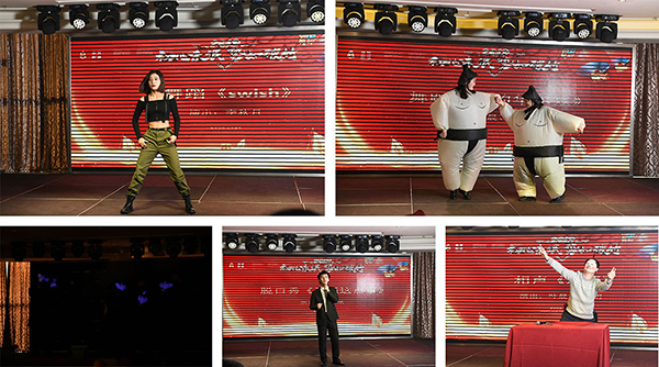 高产的电销部这次不仅派出了新生代美女代表李秋月献跳性感火辣的爵士舞《swish》,还别出心裁的表演了搞笑版的美女相扑舞蹈《爱的华尔兹》和手影舞《遇见》。果然姜还是老的辣,电销老将叶晨、柳智明倾力表演的双簧爆笑全场,观众们笑得前仰后合,而我们的新人王 沈陈斌带来的脱口秀 《君通这点事》和歌曲《挪威的森林》也让我们感受到他工作之外的魅力。