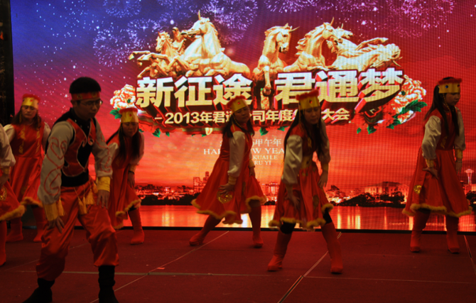 银蛇辞旧岁,金马报春来,一年一度的君通春晚盛会的大幕拉开了,2014年君通春晚的主题是《新征途 君通梦》,晚会的地址位于无锡东绛的同庆楼举办。下午13时许,参加演出的人员及嘉宾陆续到达会场,2014年君通全体同仁的年夜饭可以称得上是历年之最的一道文化大餐,金碧辉煌的大厅,led的电子显示屏,完美的音响效果为本年度的春晚增添了无限的亮丽!