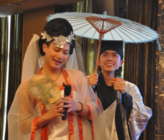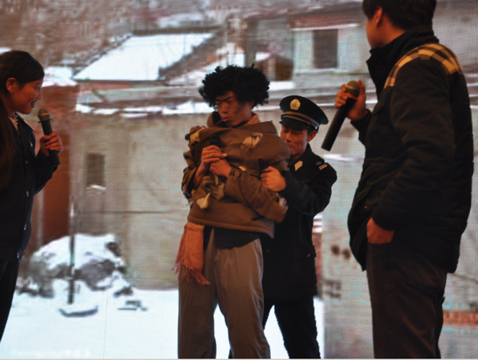 我看到“小青”,我大跌眼镜啊,我突然有点晕船的感觉,那是浦斌啊,小青婀娜多姿的身材在你身上让我们哭笑不得啊,常言道,有情人终成眷属,许仙和白娘子相遇,出演许仙的是新人叶晨,一个字,帅,唱功不寻常。终于“超哥”与许仙相会了,天上下起了小雨,我们全场再一次被雷到了,小青你居然是人工降雨啊,采用打农药的喷雾器,我不得不佩服“三个男人一台戏”,居然有这么好的效果。最佳小品奖你们是当之无愧啊!!