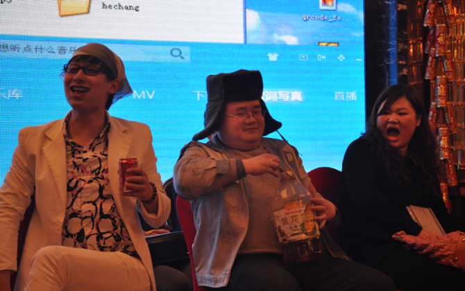 还有一个小品我不得不说啊,眼下,网络词汇最为流行就是屌丝,二货,今年晚会的有一个新看点,是由设计部带来的《当屌丝遇见二货》,这个节目没有太多的语言或是对话交流,全是采用动作及行为艺术展现出来的,这个节目让我们真正领略了什么是屌丝,什么是二货,参演中爽的是饰演“屌丝”的超哥,苦的了是参演“二货的‘的杜工啦,超哥你吃的是汉堡,喝的是可乐,然“杜工”,你吃的是压在屁股下的馒头加大葱蘸牙膏,喝的是纯正的金龙鱼油啊。我深深的被你们的演出折服了。又是一组强劲的组合!