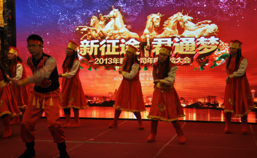 首先是由我们客服中心演绎的《策马奔腾》来迎春,寓意着来年我们客服必将策马扬鞭、跳跃奔跑、奔腾不息、马不停蹄、舞出心中喜悦,顿时将晚会开场推向高潮!台下的粉丝们手舞银光棒,拍打节拍high了起来!一幕《策马奔腾》仿佛让在座的各位置身于辽阔无疆、晚霞映红的蒙古草原,看到的是手握套马杆的小伙子和挥动牧羊鞭的姑娘骑着骏马在草原上往来穿梭。。。。。。