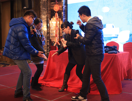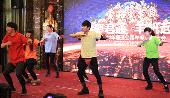 然后是由客服部小伙伴们活力四射地为大家演绎的《喜气洋洋》,祝福大家:天天开心“喜羊羊”,事事如意“美羊羊”,工作愉快“得意羊羊”,合家幸福“暖羊羊”,尤其是领舞的帅哥太帅了、几个街舞空翻动作连做让全场high翻了: |