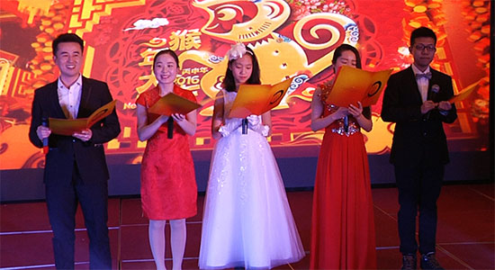 下午,令人激动的春节晚会终于开始了,今年主持人全是新面孔,其中还有我们技术部的卢啸啸,今年他是首次在君通的舞台上做主持,别看他憨厚的样子,说起话很溜,不知道的人完全感觉不出是第一次做主持,此外还有一位特殊的主持,她是我们邓经理的女儿--邓卓妍,一段时间没见,已经亭亭玉立,今年也是她首次担任主持。