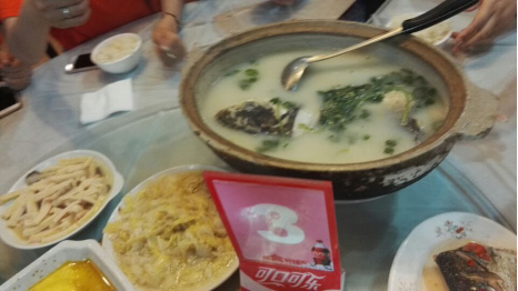 在品味过天目湖的白茶后,大家都已经是饥肠辘辘,来到饭店后,我们终于尝到了传说中的鱼头汤,汤的味道不同于普通的鱼汤,味道鲜美而且能感觉到自然的味道,在鱼头汤的面前,其他的菜都已经黯然失色,没过多久汤就被大家分光了。