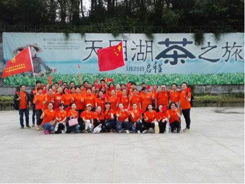一路上欢歌笑语不知不觉我们到达了目的地----天目湖,大家有序的下车跟着我们的导游向着天目湖景区入口走去,当然,我们君通人在哪里都要留下我们一大家人的合影,我们都穿着公司的统一T恤,大家喊着统一的口号手里挥着君通的旗帜,开心的一幕留下了!
