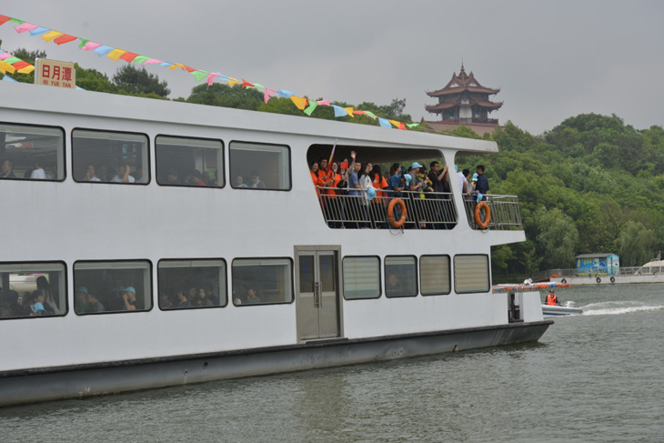 首先是伙伴们一起乘船到龙兴岛,哇塞,好大的舰艇,让我不禁想起了台湾的日月潭,没想到在天目湖也有这么高大上的舰艇,伙伴们好兴奋: