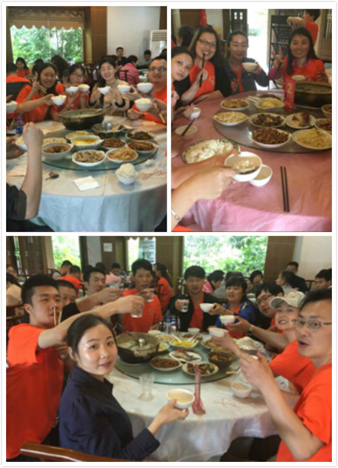 对,你没看错,除了以康总、蒋超、谈师傅、彭郁等为首的男人帮参加了滑索,我们也有杨红、张雯、丁玉、沈秋萍、花丹丹等几位女中豪杰也参加了本次高空滑索。。。。。。再次为他们勇于挑战的勇气点赞加分,就在大家纷纷赞叹他们、给他们欢呼庆祝他们挑战成功时,汪导要带我们去吃大餐了: