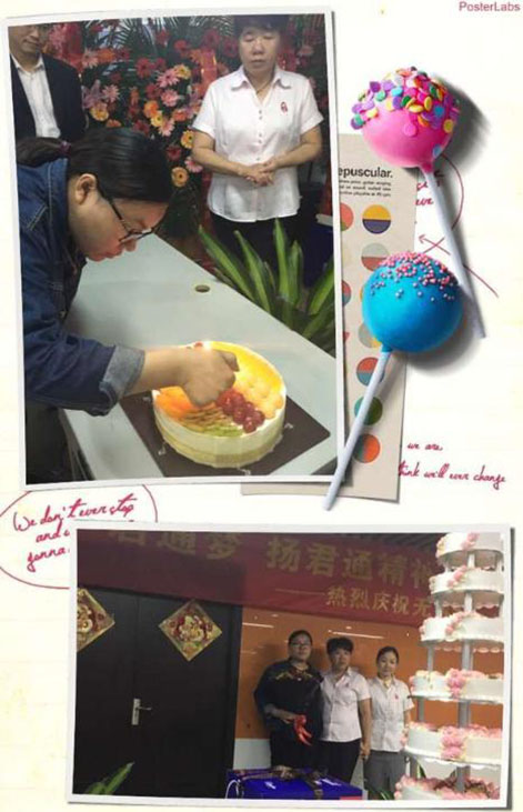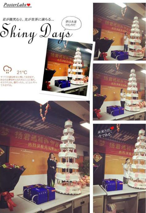 说出对尹总、对公司的各种感激的情愫和送出对公司的祝福后,伙伴们最最期待的大蛋糕的心都快融化了,不过别急,在品尝我们17岁的大蛋糕前,尹总突然邀请软件部的茹宁上台,原来今天也是软件部茹宁的生日,贴心的尹总特意为她献上了鲜花和蛋糕: