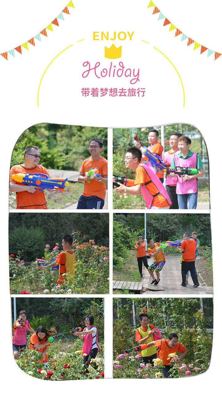 中午休息时间,我们扎堆儿的在聊生活,畅谈人生,下午2点钟我们准时开始活动,先是大脚板游戏,这个游戏要求每个成员相互配合共同完成,大家一起喊着口号一二一二,左右左右,已经不去过份关注成绩了,只要我们一起到达终点就已经成功了。然后就是水枪大战了,一人一枪,分队行动,战争顿就打响了。不一会儿工夫大家就都湿身了,但是还是玩得不亦悦乎,找到了童真,仿佛回到了童年时代。