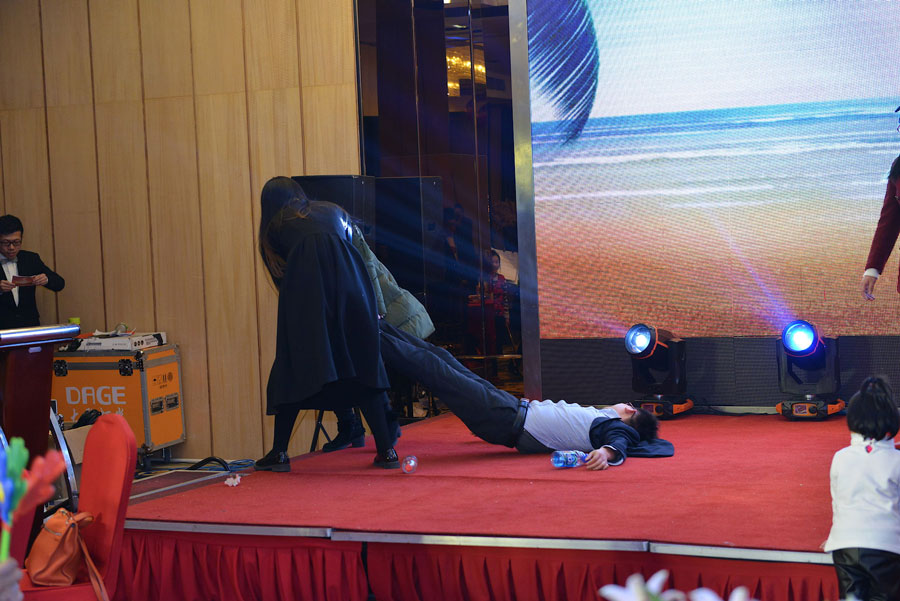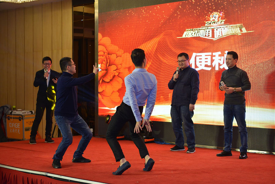 尤其值得一提的是平均年龄最大的市场部,他们带来的舞蹈《C哩C哩》动作整齐有力,充满激情,向大家展示了矫健的身手,乔总邓总的花式加入更是锦上添花。同时他们和技术部的跨部门合作小品《我们都是木头人》爆笑登场,将晚会气氛再次推向高潮,赢得大家的阵阵掌声和欢呼,为晚会填上了绝妙难忘的一笔。一张桌来四张口,却好似有着魔力,不断挠着观众笑点,台下笑声不断。