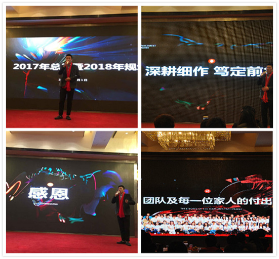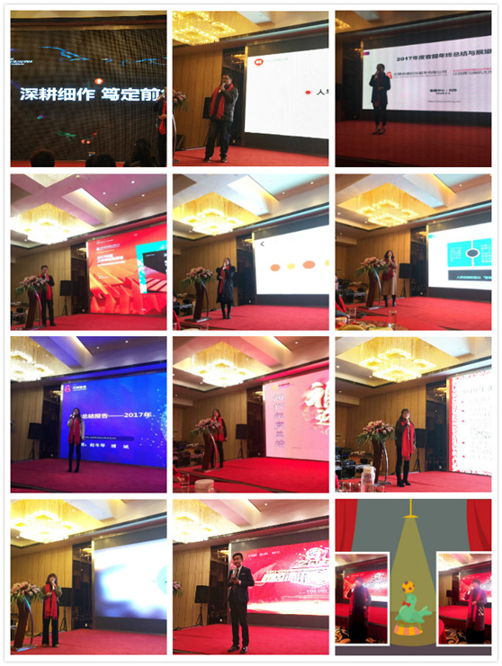 接下来依次就是技术部的杜总,客服部的刘苏,设计顾工、行政顾雪萍、人事何淑琴、市场大区经理赵经理、张经理、宋经理、电销高经理齐经理等纷纷上台就各职责部门2017年度的工作做总结报告与2018年工作的展望。最后我们的大家长尹总也做了精彩的发言,希望大家一起齐心协力,携手奋进,撸起袖子加油干!