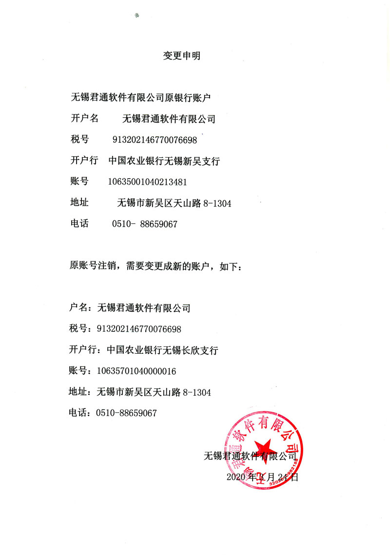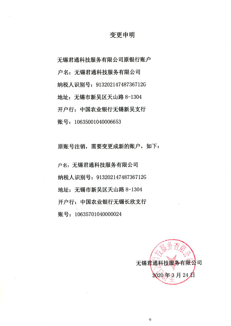 无锡君通软件有限公司、无锡君通科技服务有限公司原银行账户注销,需要变更成新的账户,具体申明信息见附图: