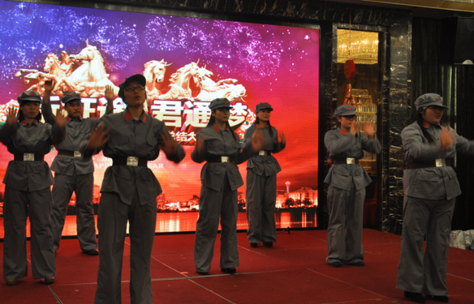 舞蹈类的,像有市场部的辣妈们为大家带来的《trouble maker》,现场一阵欢呼,难以置信,标准整齐的节奏感,令我们这些小年轻佩服。还有商务三部带来的舞蹈《咏春》,幽静的音乐,委婉的,婉约派的舞蹈,让我们感受到了,另一样的舞蹈文化冲击。商务一部带来的舞蹈《壮志雄心》,红军的服装,舞蹈具有较强的力度感,让大家感受到--为梦想而战的激情豪迈。