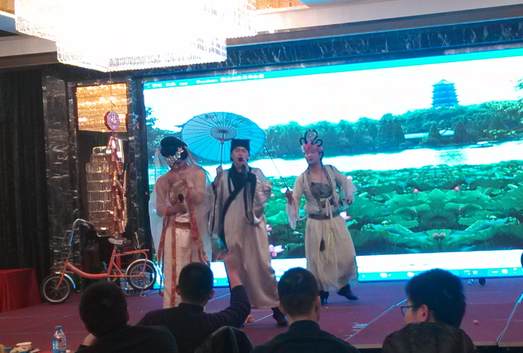 首先是由设计部周俭、杨红等带来的视觉舞蹈《黑与白》让我们眼睛一亮、黑与白原来可以那么美。。。紧接是华雨亭、刘晶等的小品《拍戏》带领我们一起踏进上海滩去看强哥跟程程