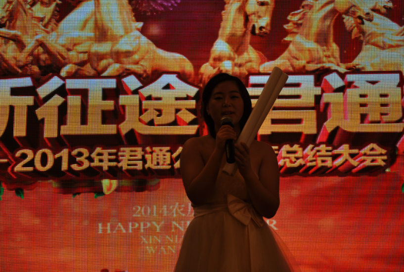 再次是激动人心的君通一年一度的对销售top、优秀员工的表彰与奖励,每个销售精英、优秀员工们喜获大奖的身影,深深地感染了在座的每一位,此时此刻荣获殊荣的他们过去一年所有的付出都值了!我当时心中就想:我自己2014年一定要做出骄人成绩,也能上台让尹总给我颁个奖,哈哈,暗自又给自己定了一个新年目标!